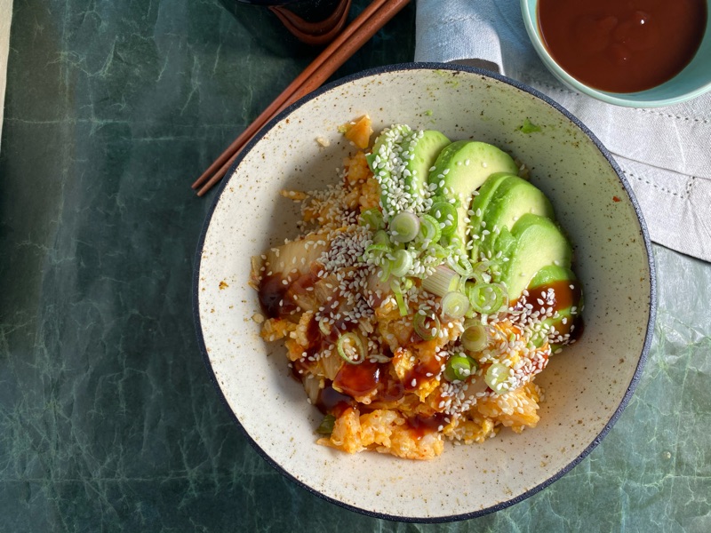 Skiva avokadon och lägg på riset. Ringla över Tonkatsusåsen och toppa med koriander, salladslök om du har men annars är det lika gott utan.