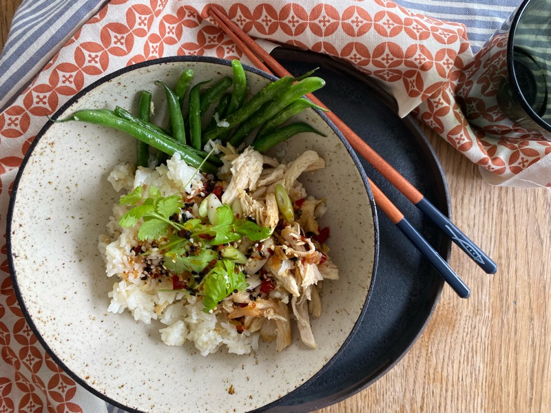 Ta av från spisen och lägg upp ris och haricot verts i en skål och häll sedan över sojan över kycklingen. Börja med 1/2 msk och smaka av om du vill ha mer. Rör ett varv och lägg den också skålen.