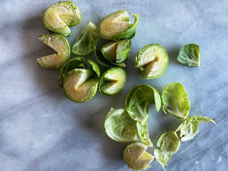 Koka upp saltat vatten till nudlarna. Under tiden pillar du loss bladen från brysselkålen och hackar vitlöksstjälkarna.