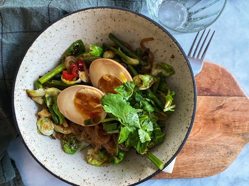 Jag kör på med brysselkålen och så hittade jag vitlöksstjälkar på Oriental Supermarket. Herregud så gott! Om du har en liknande butik i närheten så köp det säger jag bara. De är inte nödvändiga för den här lunchen. Lite vitlök eller salladslök går också bra och nudlarna kan du såklart ta vilken sort som helst.
