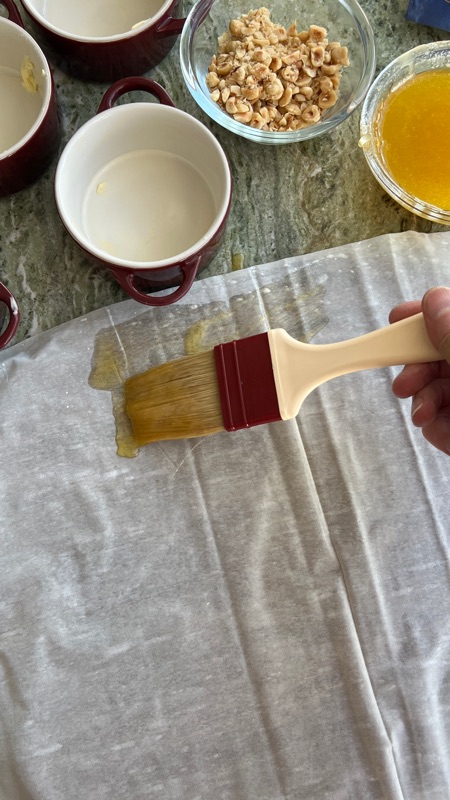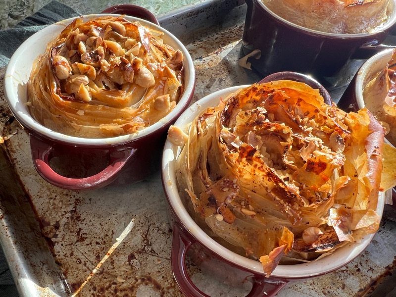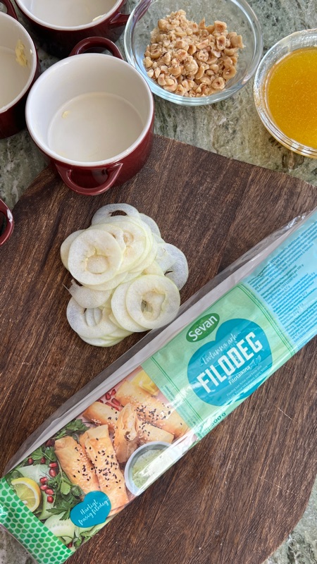 En gång om året bestämmer jag mig för att jobba på mina croissant-skills men detta vikande, kavlande och vilande av degar kräver mycket mer än jag har tålamod för. Därför hänfaller jag alltid åt filodegen. Det är ju fraset och de många lagren man vill åt och sen kan man trycka in hur mycket smör man vill mellan lagren. Det blir alltid frasigt. Ungefär, så gjorde jag här.
