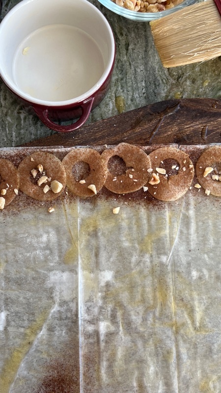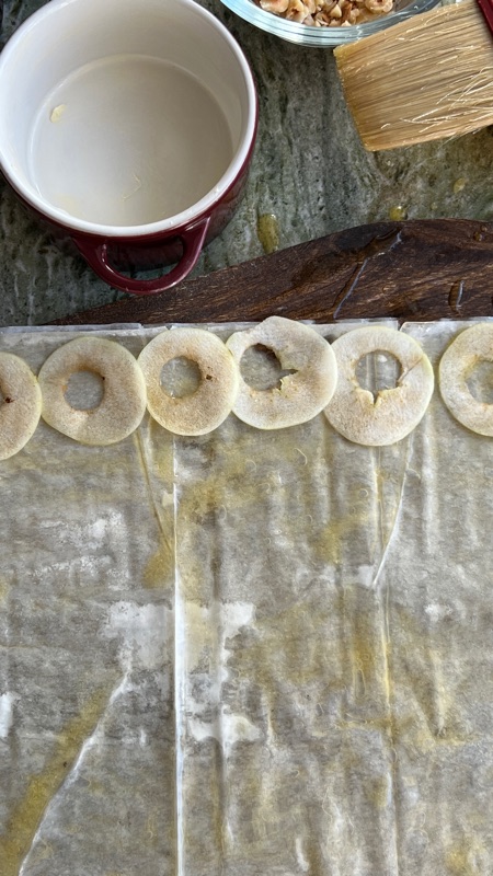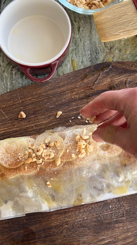 Lägg äppelskivor på längden längs den övre kanten, strö över kanel och hasselnötter och vik därefter över filodegen som en dragspelsvikning.