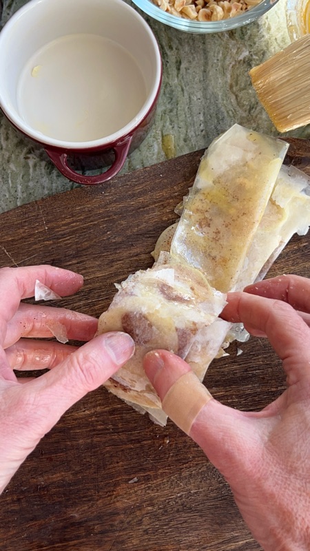Rulla ihop arket så att det blir som en snurra. Lägg i ugnsformen och upprepa med resterande tre snurror.