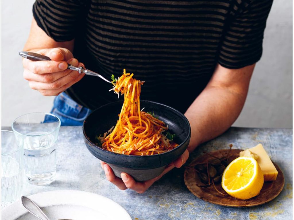 Förutom omelett och pannkakor är det här det första recept jag lärde mina barn att laga själva. Det finns såklart med i min bok. Inget slår en bra tomatpuré för att få till den där djupa smaken av tomat. Jag tycker att Itigos ekologiska tomatpuré slår alla men du tar vad du har tillgång till. Sen har vi det där med pastavattnet. Det är den bästa redningen. Stärkelsen som frigörs när du kokar pastan gör att du får en krämig pasta. Här är det m a o bra med en torkad pasta med längre koktid.