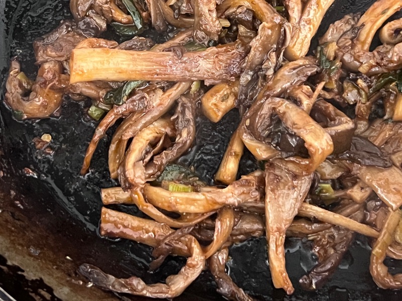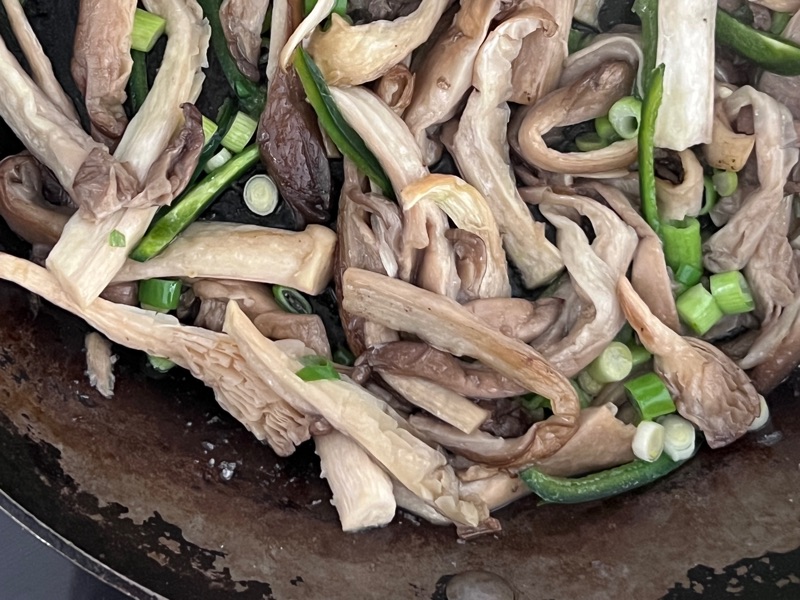 Riv ostronskivlingen i bitar, hacka vitlöken, skär jalapeñon i tunna skivor (med eller utan kärnor beroende på styrkan och din preferens när det kommer till hetta) skiva salladslöken och spar den gröna delen till garnering.