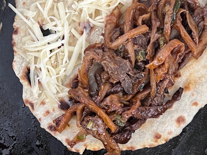 Birria Tacos. Vad är det säger kanske någon? Ja, det är ett tortillabröd som du doppar i sås, steker med ost som får smälta innan du viker och fyller med goda grejer. Alltså ett tacoskal som är segt och ostigt på mitten och lite krispigt på utsidan. Det är dubbelgott helt enkelt. Traditionellt görs den på kött som fått koka tills det blir alldeles underbart mört och smakrikt. Det är också såsen från detta som du doppar tortillan i innan stekning. Men nu är jag ju inte så traditionell av mig och jag har ett svamphus som fortsätter att leverera ostronskivling så det är blir en otraditionell men jä***gt god Birria Taco. Ostronskivling är en grym svamp. Den tar åt sig smakerna du ger den, har en bra konsistens och är lätt att tillreda. På sommaren när jag har stekbord på grillen då kan jag laga 6 åt gången. I Stekpanna på spisen är det liter mer begränsat men då brukar jag langa ut dem efter hand. Jag har inte fått klagomål hittills.