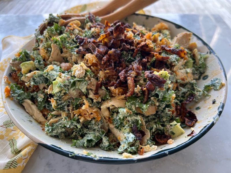 Nu är det salladssäsong. Med det menar jag inte Beach 2026 för sånt trams har jag slutat hålla på med. Nej, jag menar säsongen när man inte behöver varm mat för att överleva. Jag vill nästan påstå att när det kommer till matiga sallader är jag i mitt A-GAME. Tänk mycket grönsaker (såklart), texturer, färger och form och så generöst med smak i form av örter, lök och umami. Och viktigt. I med matiga grejer som ost, nötter, fisk, tofu, kyckling, bacon, ris, bulgur, pasta osv. Och kom ihåg. Frukt i sallad är en banger! Då kommer t o m den kräsnaste tonåringen att äta sallad.