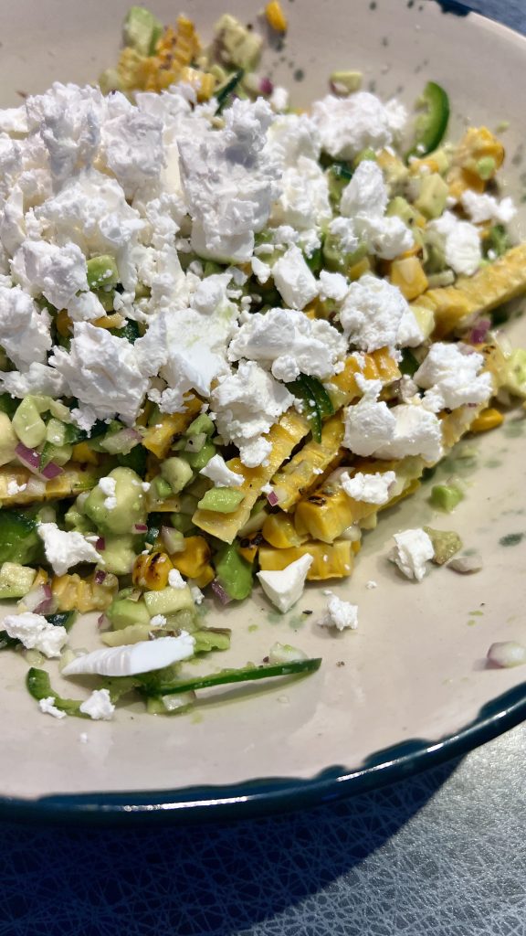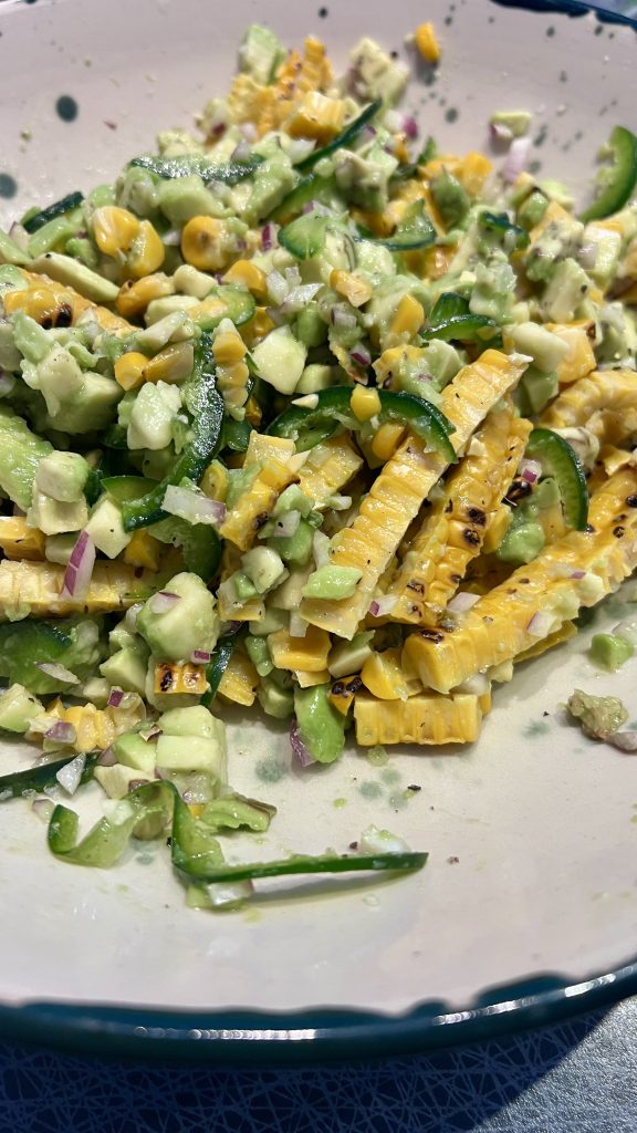 Skär av majsen i tunna strimlor och tillsätt till avokadon. Salta lätt och blanda.