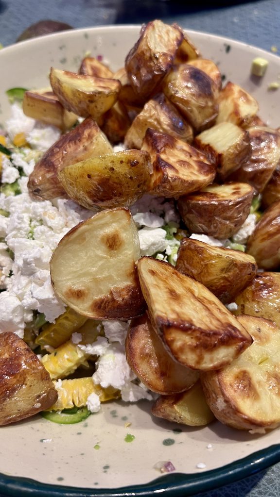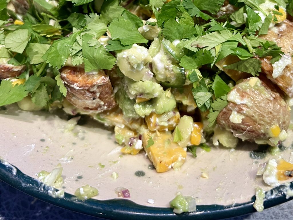 Ta ut potatisen ur ugnen och låt den svalna. Blanda sen ner den i salladen och smula över vitosten och tillsätt koriandern.